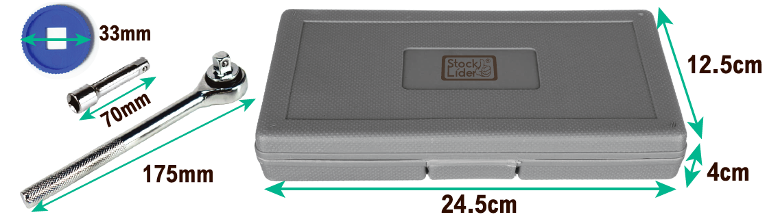 Incluye una llave de carraca de 3/8” con mango antideslizante, que proporciona un agarre firme y cómodo, permitiendo trabajar con mayor seguridad y control. Los vasos y accesorios están diseñados para un encaje preciso, facilitando el montaje y desmontaje rápido en distintas aplicaciones.