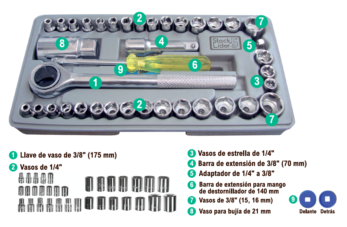 El set incorpora vasos de 1/4” y 3/8”, extensiones, adaptador, destornillador y vaso especial para bujías, lo que permite múltiples combinaciones según la necesidad del trabajo. Su sistema de bloqueo por bola evita que las piezas se desprendan durante el uso.