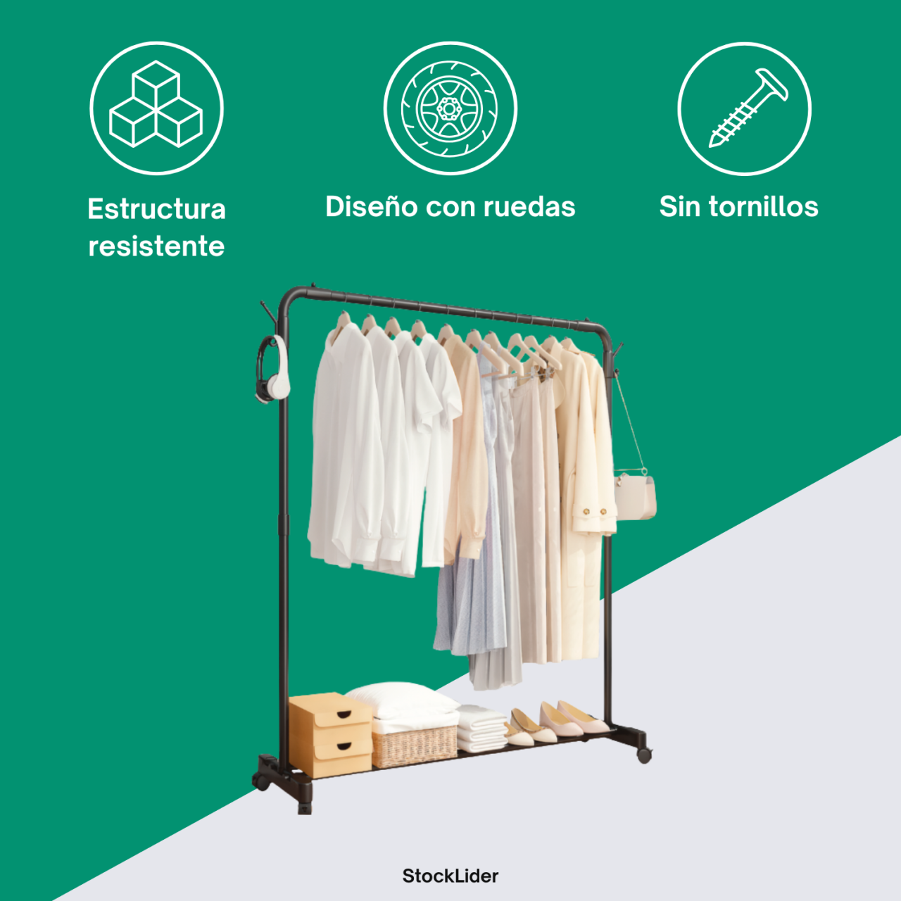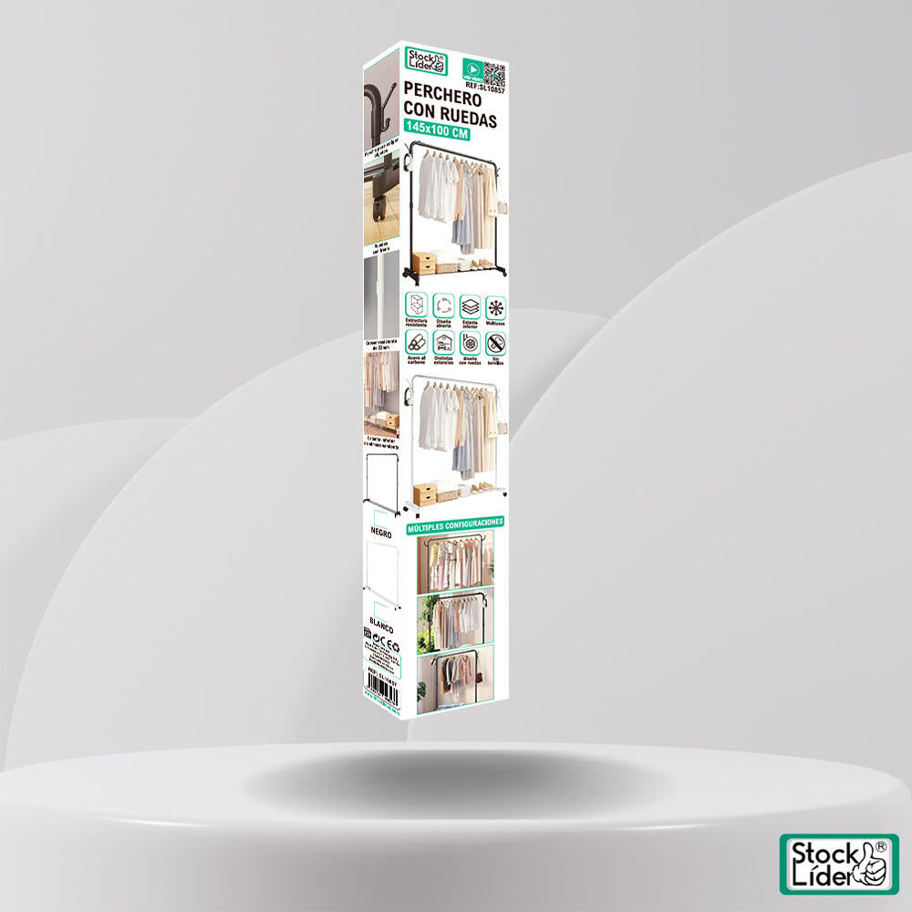 El perchero con ruedas Stock Líder es una solución práctica y funcional para organizar y transportar ropa con total comodidad. Gracias a su estructura metálica resistente y su diseño abierto, permite colgar prendas de forma ordenada y accesible, siendo ideal tanto para el hogar como para espacios profesionales.
