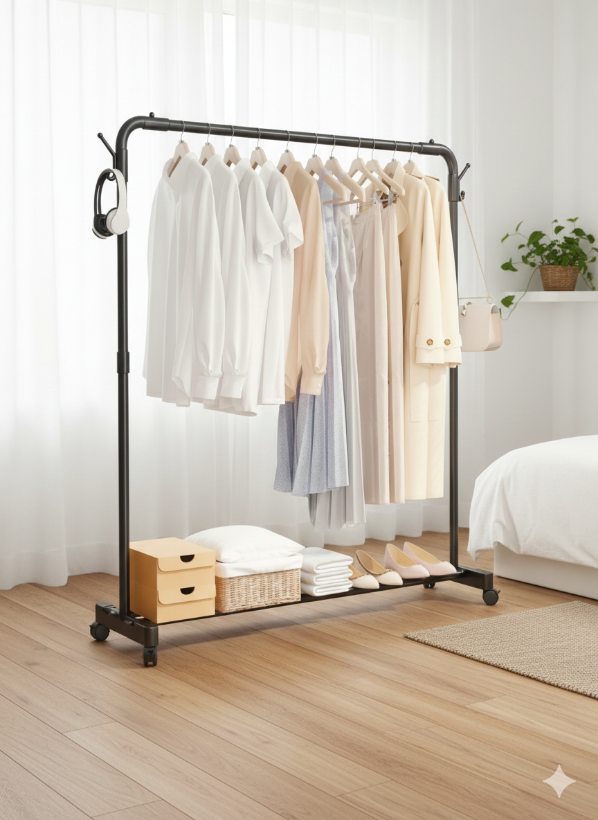 Con unas dimensiones amplias y un estilo moderno, este perchero es ideal para dormitorios, oficinas, camerinos, tiendas, salones o balcones, ofreciendo versatilidad, orden y movilidad en un solo producto.