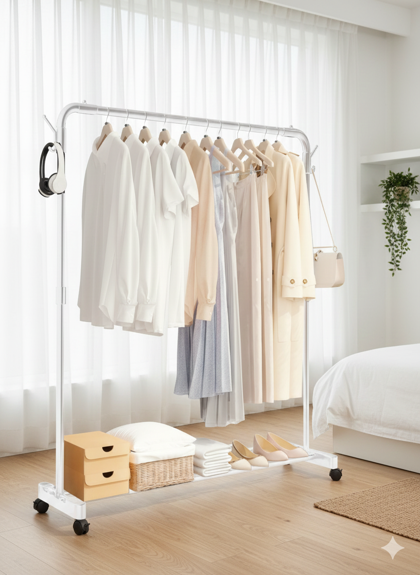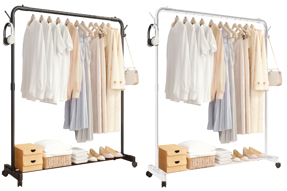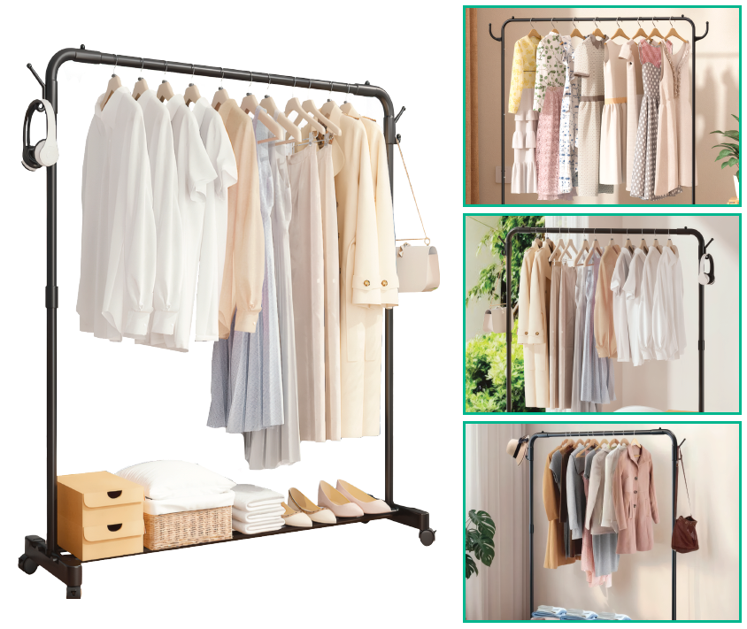 Incorpora ruedas con freno, lo que facilita su desplazamiento entre estancias sin esfuerzo y garantiza estabilidad cuando se necesita fijar la posición. Su barra superior de acero engrosado soporta un uso diario intensivo, mientras que los ganchos laterales permiten colgar bolsos, accesorios u otros objetos.
